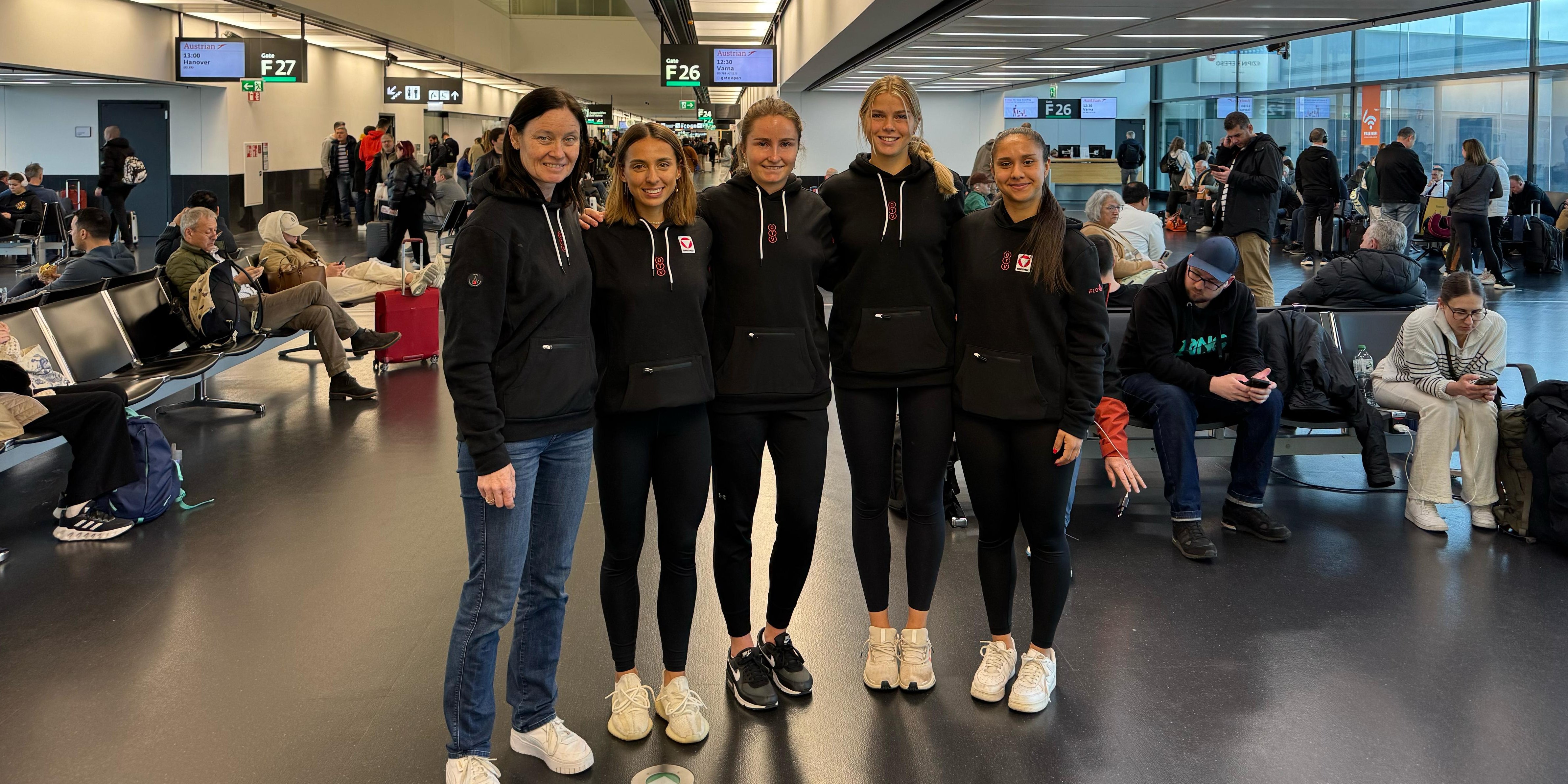 Das Abenteuer Litauen geht los! Österreichs Billie-Jean-King-Cup-Team hat am Sonntag zu Mittag vom Flughafen Wien-Schwechat ausgehend nach Vilnius abgehoben, wo vom 8. bis 12. April in der SEB Arena die Europa/Afrika-Gruppe I über die Bühne geht. Mit an Bord: ÖTV-Sportkoordinatorin und -Billie-Jean-King-Cup-Kapitänin Marion Maruska, ÖTV-Sportdirektor und -Davis-Cup-Kapitän Jürgen Melzer, mit Tamara Kostic, Arabella Koller, Ekaterina Perelygina und Mavie Österreicher vier der fünf Spielerinnen, zudem Masseur Werner Farmer und Physiotherapeutin Katrin Müllner. Nicht dabei ist einzig die Nummer eins des ÖTV-Damenteams, Julia Grabher – das allerdings aus erfreulichen Gründen: Die Vorarlbergerin gewann am Sonntagvormittag noch das Endspiel des ITF-W35-Turniers in Santa Margherita di Pula und reist ins Baltikum nach. Österreichs Team trifft dort in der Gruppe D von Dienstag bis Donnerstag auf Kroatien sowie in noch nicht feststehender Reihenfolge auf Portugal und Lettland. Zudem folgt am Samstag (außer bei Platz drei in der Gruppe, der direkt den Klassenerhalt sichert) ein Play-off – entweder um eines der vier Tickets fürs im Herbst steigende Play-off zur Qualifikationsrunde für die Billie Jean King Cup Finals 2026 oder aber gegen den Abstieg in die Europa/Afrika-Gruppe II (bei Platz vier in der Gruppe). Alle Begegnungen der ÖTV-Auswahl in Litauens Hauptstadt werden live auf ÖTV TV unter www.oetv.tv übertragen.