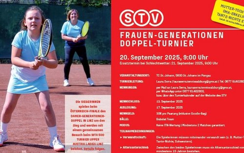 In den vergangenen Jahren wurde das Damen-Generationen-Doppelturnier erfolgreich in Salzburg – unter anderem beim UTC Oberalm und dem 1. Salzburger TC – ausgetragen. 2025 findet die beliebte Veranstaltung nun erstmals in St. Johann im Pongau statt. Am Samstag, den 20. September 2025, ab 9:00 Uhr, wird die Anlage des TC St. Johann zum Treffpunkt für tennisbegeisterte Frauen aus mehreren Generationen. Als Ersatztermin ist Sonntag, der 21. September 2025, vorgesehen.