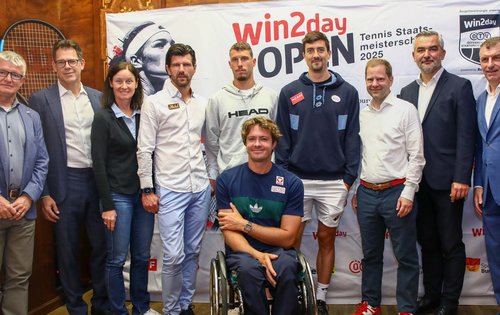 Bei einer Pressekonferenz im Café Landtmann in Wien von links nach rechts: Thomas Schweda (ÖTV-Geschäftsführer Wirtschaft), Georg Blumauer (ÖTV-Vizepräsident), Marion Maruska (ÖTV-Sportkoordinatorin und -Billie-Jean-King-Cup-Kapitänin), Jürgen Melzer (ÖTV-Sportdirektor und -Davis-Cup-Kapitän), Titelverteidiger Filip Misolic, Rollstuhltennis-Titelverteidiger Nico Langmann, Sebastian Ofner, Georg Wawer (Managing Director win2day), Mag. Heinrich Dorner (Sportlandesrat Burgenland), Günter Kurz (BTV-Präsident, Veranstalter).
