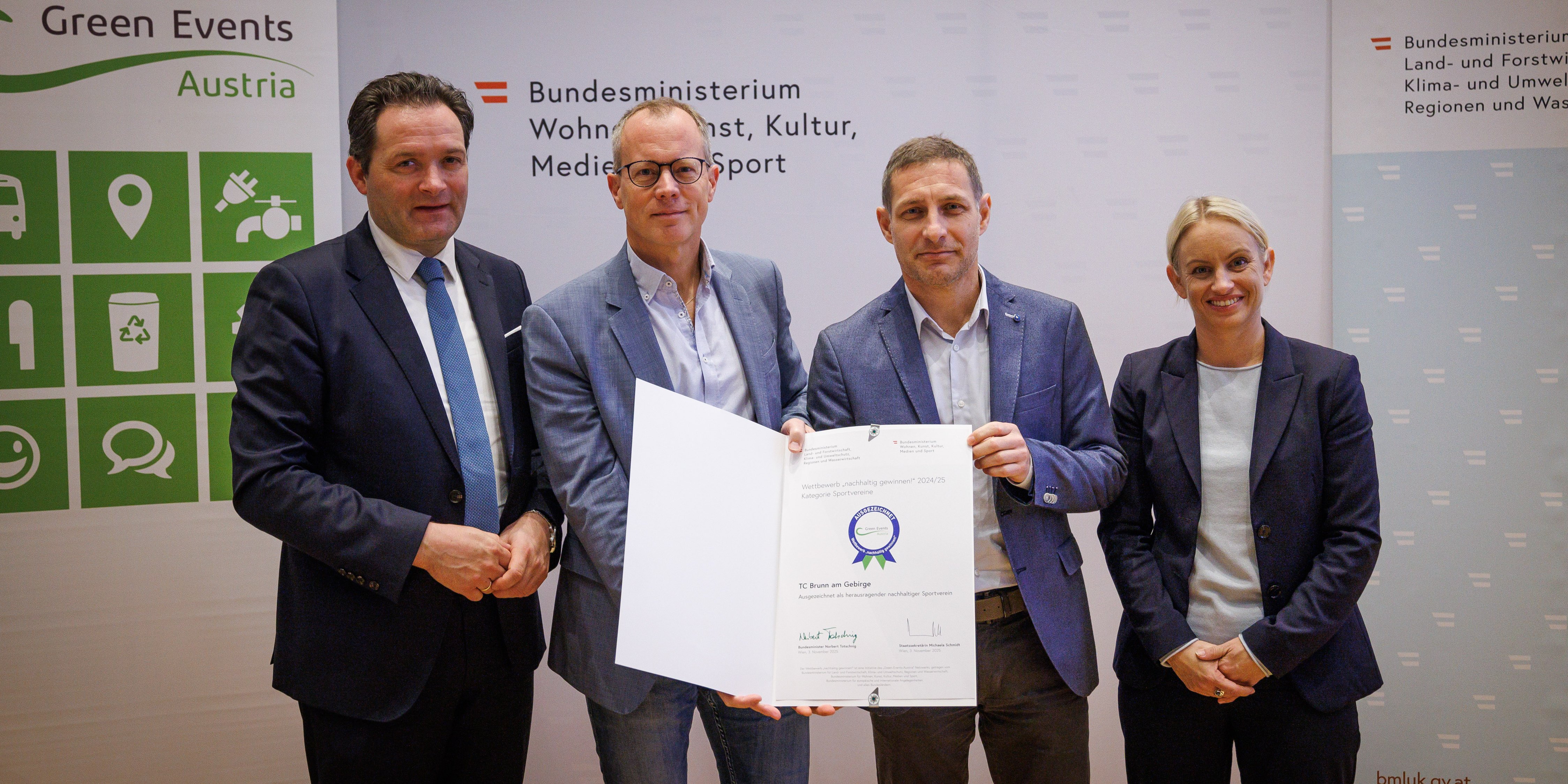 Großer Bahnhof für den TC Brunn am Gebirge! Norbert Totschnig, Bundesminister für Land- und Forstwirtschaft, Klima- und Umweltschutz, Regionen und Wasserwirtschaft, und Michaela Schmidt, Staatssekretärin im Bundesministerium für Wohnen, Kunst, Kultur, Medien und Sport, haben gemeinsam mit dem „Green Events Austria“-Netzwerk die 29 nachhaltigsten Feste, Kulturevents, Sportveranstaltungen und Sportvereine in Österreich gewürdigt – und der im Jahr 1972 gegründete, traditionsreiche Verein aus dem Kreis Südost in Niederösterreich war mittendrin statt nur dabei, unter den zwölf Sieger:innen des Wettbewerbs „nachhaltig gewinnen!“. Denn im Rahmen der Green Events Austria Tagung & Auszeichnungsveranstaltung am 3. November im dritten Wiener Gemeindebezirk wurde der TC Brunn am Gebirge nach seiner Nominierung 2020/21 und seinem Sieg 2023/24 zum nunmehr zweiten Mal ausgezeichnet, und zwar in der Kategorie Sportvereine 2024/25. Die diesjährigen Nominierten und Ausgezeichneten erhielten ein Preisgeld von insgesamt 20.000 Euro.
