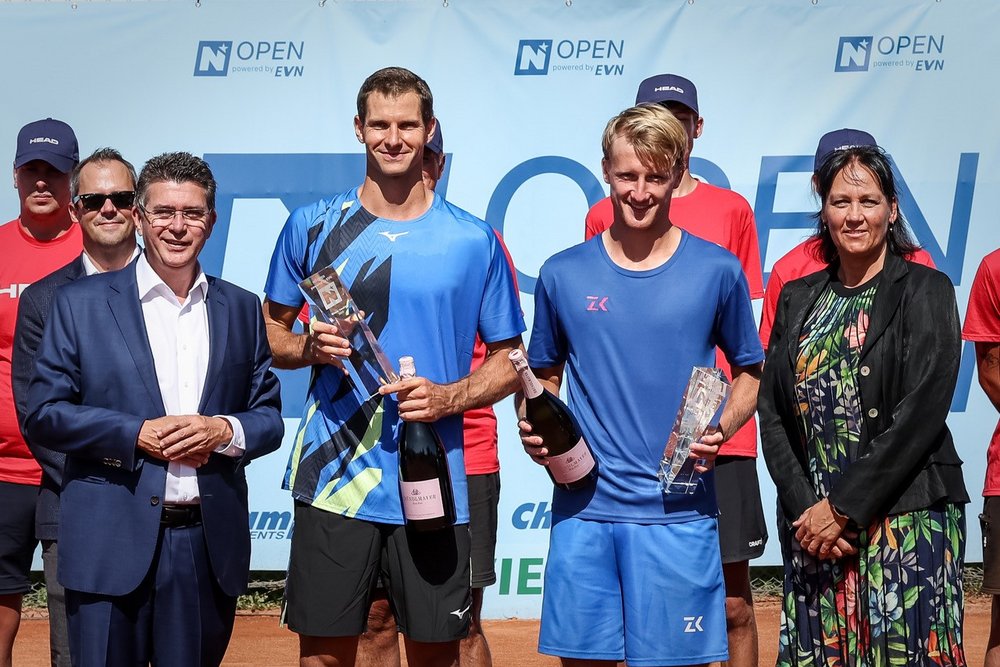 Den Anfang machten an diesem Samstag zwei Paare, deren Einzelteile sich auf der ATP Challenger Tour und jener der ITF bereits jede Menge Meriten erarbeiten konnten. Diesbezüglich die Nase vorne haben der Slowene Blaz Rola (ATP-Doppel 268, sechs Challenger-Titel) und sein tschechischer Partner Zdenek Kolar (ATP-Doppel 145, 14 Challenger-Titel). Der Pole Piotr Matuszewski (ATP-Doppel 146) hält bei drei Challenger-Titeln im Doppel und sein Deutscher Partner Kai Wehnelt (ATP-Doppel 181) konnte 22 ITF-Turniere gewinnen. Auf dem Weg ins Tulln-Finale schlug man jeweils auch deutlich höher eingeschätzte Duos. Kolar/Rola etwa zum Auftakt die an Nummer drei gesetzten Tschechen Roman Jebavý (ATP-Doppel 103) und Petr Nouza (ATP-Doppel 100), Matuszewski/Wehnelt wiederum kickten im Semifinale das topgesetzte Paar Théo Arribagé (ATP-Doppel 86) und Luca Sanchez (ATP-Doppel 101) aus dem Bewerb. Dass sich letztlich Kolar/Rola in einem höchst offensiv geführten und unterhaltsamen Finale durchsetzen konnten, lag hauptsächlich am minimal besseren Rückschlag-Percentage. Das Endresultat: 6:4, 4:6 und 10:6 im Match Tiebreak. Den Siegespokal überreichte Tullns Bürgermeister Peter Eisenschenk im Beisein von NÖTV-Präsidentin Petra Schwarz und Jürgen Eisner als Vertreter der Hypo Landesbank.